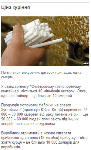 "Сигарета – найбільш смертоносний артефакт в історії людської цивілізації, – каже Роберт Проктор, дослідник зі Стенфордського університету. – У ХХ столітті від неї померли близько 100 мільйонів людей".
