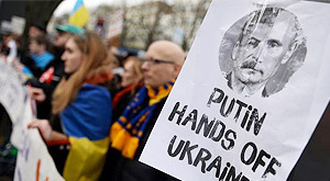 На одному з плакатів президента Путіна зображено разом із радянським диктатором Йосипом Сталіним. Напис на плакаті: "Путіне, руки геть від України".