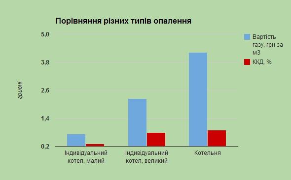 "Всі, хто користуються індивідуальним опаленням, вчасно платять за газ. Зникають витрати для транспортування теплової енергії. Найуспішніший приклад переходу – Закарпаття. Менш успішні – Овруч на Житомирщині та Стаханов на Луганщині. Але переваги має і централізоване опалення: можливість використання альтернативного палива – відходів деревини, вугілля, тощо. Це й більший коефіцієнт корисної дії, менші викиди у довкілля. Переходячи на індивідуальні котли, ми губимо здоров’я дорослих та дітей".