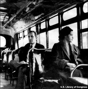 Роза Паркс разом із журналістом на передніх сидіннях автобусу у Монтгомері, Алабама, у 1956 році – після того, як Верховний суд визнав сегрегацію у громадському транспорті антиконституційною. Рішення суду стало наслідком бойкоту, який оголосила Паркс та її прихильники.
