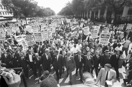 Лідер руху за громадянські права Мартін Лютер Кінг (третій зліва) під час "Походу на Вашингтон" (28 серпня 1963 року). Понад 200 тисяч активістів взяли участь у ході, яку сам Кінг назвав "найбільшою демонстрацією за свободу в історії Сполучених Штатів".