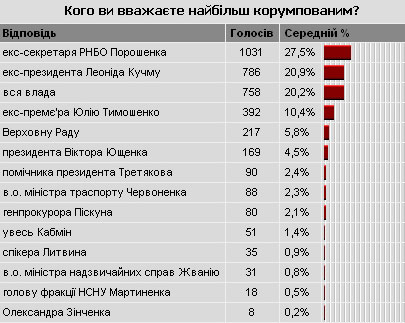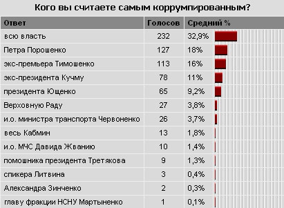 Екс-президента Кучму вважають "найбільшим корупціонером" лише 78 (11%) опитаних на російській версії сайту, президента Ющенка - 65 (9,2%), Верховну Раду - 27 (3,8%), в.о. міністра транспорту Червоненка - 26 (3,7%), весь Кабмін - 13 (1,8%), в.о. МНС Давида Жванію - 10 (1,4%), помічника президента Третякова - 9 (1,3%).