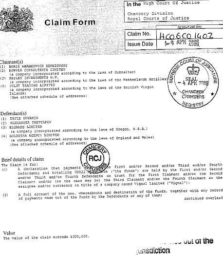 Як зазначається у позові, в 2003 та 2004 роках Березовський на прохання Жванії та Третьякова перевів гроші в сумі 13,85 мільйонів доларів на рахунок компанії "Елгрейд лімітед", а також 9 мільйонів доларів на рахунки компанії "Голдстар Айдженсі лімітед".