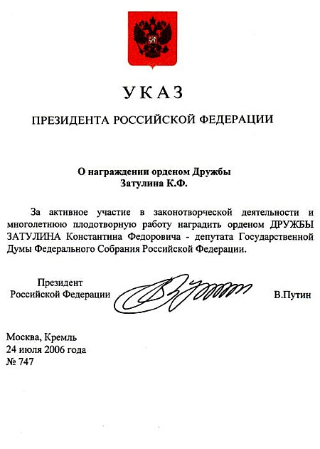 Президент Росії Володимир Путін нагородив депутата Держдуми РФ, директора Інституту країн СНД Костянтина Затуліна орденом Дружби.