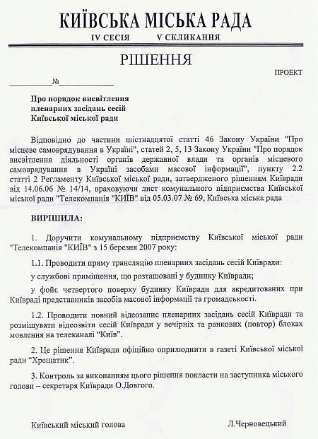 Так, документом дозволено транслювати засідання лише у службові приміщення Київради і для акредитованих представників ЗМІ.