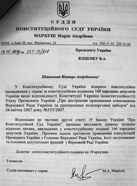 Цей лист за підписом Маркуш направлено до президента Віктора Ющенка з проханням надати протоколи про проведення консультацій президента з головою Верховної Ради, його заступниками та лідерами фракцій.
