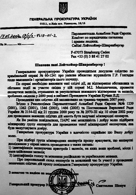 Про це йдеться в листі генпрокурора Святослава Піскуна до доповідача ПАРЄ у справі Гонгадзе Сабіни Лойтхойзер-Шнаренбергер, який потрапив до "Української правди".