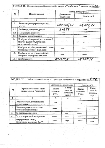 Згідно з документом, сумарний дохід прем'єра у 2006 році склав 290 725 грн., у тому числі дивіденди в сумі 210,58 грн.