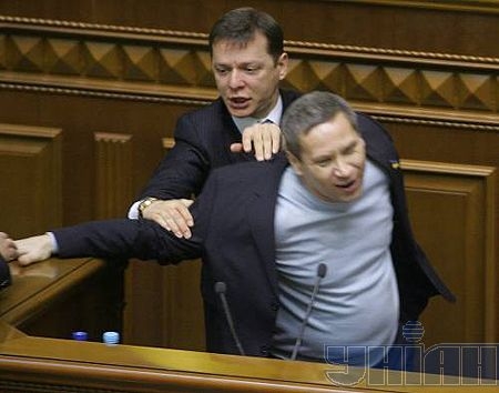 Але закінчити регіонал знову не встиг, бо в комір його костюма вчепився бютівець Олег Ляшко. До трибуни одразу підбігли інші регіонали, включаючи Бориса Колесникова. Відбулася незначна сутичка, яка тривала не більше півхвилини.