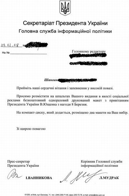 Секретаріат президента звернувся до низки друкованих ЗМІ з проханням опублікувати привітання президента Віктора Ющенка з 8 березня безкоштовно на правах соціальної реклами.