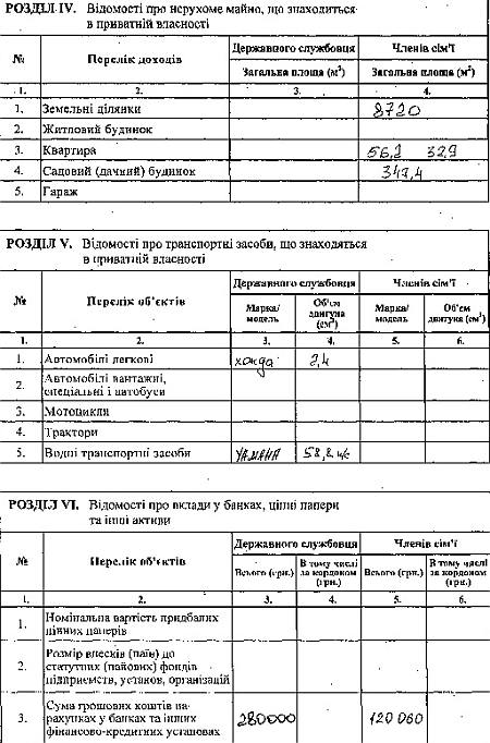 Також члени сім’ї володіють земельною ділянкою площею 8 720 кв.м., садовим будинком площею 347,4 кв.м. та двома квартирами площею 56,2 кв.м. та 32,9 кв. м. відповідно.