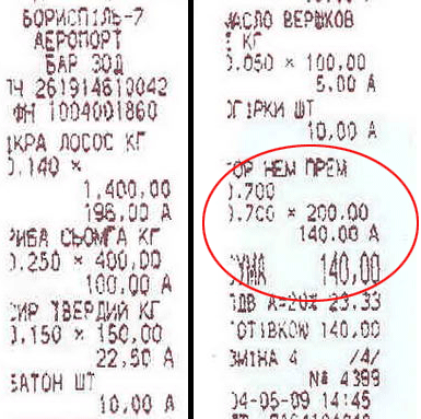 | На малюнку склеєні два чеки. "Випивка замовляється в барі "дрінками", у даному ж випадку була попросту випита пляшка горілки, вартість якої виведена з ціни 200 грн. за літр. Закуски вибивалися окремими чеками", пише "Тема". |