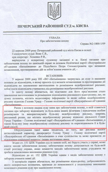 Ухвалу винесено за позовом "Батьківщини", яка у вересні 2009 року звернулася суду з позовом про визнання незаконними та протиправними дій Підлубного "щодо замовлення, виготовлення та розміщення недобросовісної реклами".
