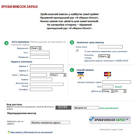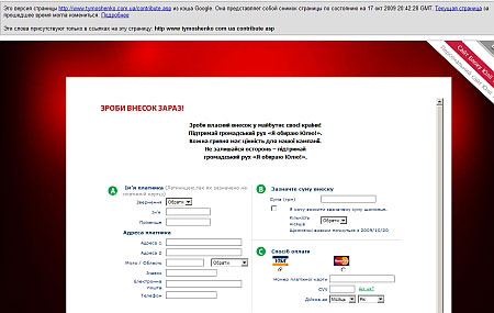 У понеділок користувачі сайту могли бачити форму, заповнивши яку прихильники Тимошенко мали можливість зробити внесок на підтримку руху.