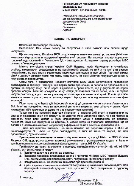 "Мені незрозуміло, чому слідчі дії розпочалися лише зараз, коли ця справа набула розголосу, а до того часу ніхто не чув ані мене, ані дітей. В якій ще країні міліція починає шукати докази через півроку після повідомлення про сам факт злочину?", - запитує Полюхович.