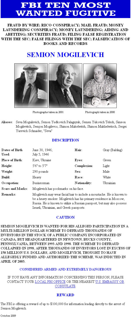 В повідомленні ФБР вказується, що Могилевич живе в Москві, де російські закони забороняють екстрадицію до США.