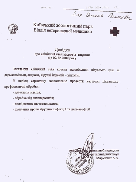 Відповідну довідку після огляду президентського кошеняти надали у відділі ветеринарної медицини Київського зоопарку.