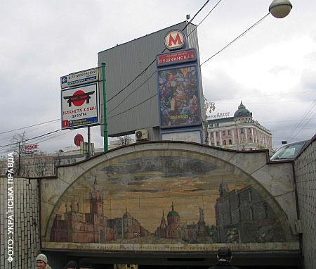 На мармуровому мозаїчному панно було зображено види Москви початку минулого століття. Панно були розміщені над входом на станції метро "Пушкінська" і "Тверська", що в центрі Москви.