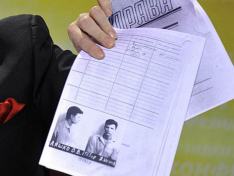 Ющенко продемонстрував сторінки з фото Ляшка, відбитками його пальців. "Це його відбитки пальців? Ніг, рук, вух мабуть. Це він?" - зазначив Ющенко.