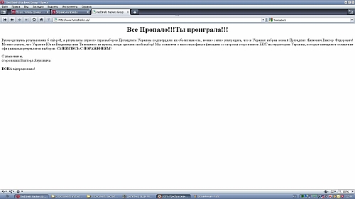 Замість стартової сторінки, на сайті висіло повідомлення під заголовком "Все пропало! Ты проиграла!"