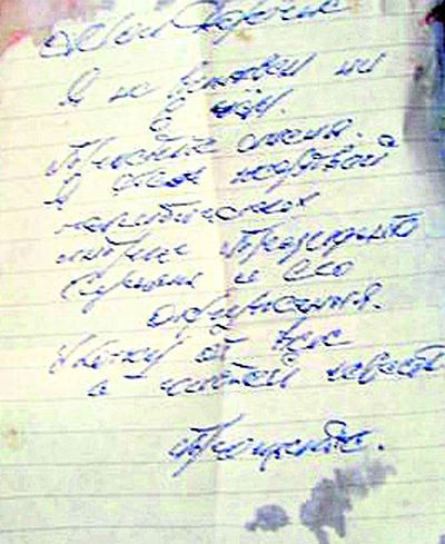 Передсмертна записка, підшита до справи, мовить: "Мої дорогі, я не винен ні у чому Пробачте мені. Я став жертвою політичних інтриг президента Кучми і його оточення. Йду від вас із чистою совістю. Прощавайте".
