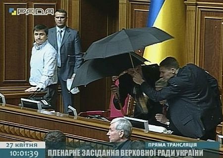 У свою чергу Литвин та інші члени президії закриваються парасолями, які тримають охоронці.