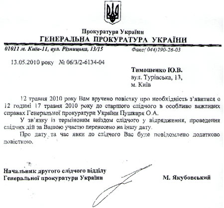 ГЕНПРОКУРАТУРА СКАСУВАЛА ДОПИТ ТИМОШЕНКО
