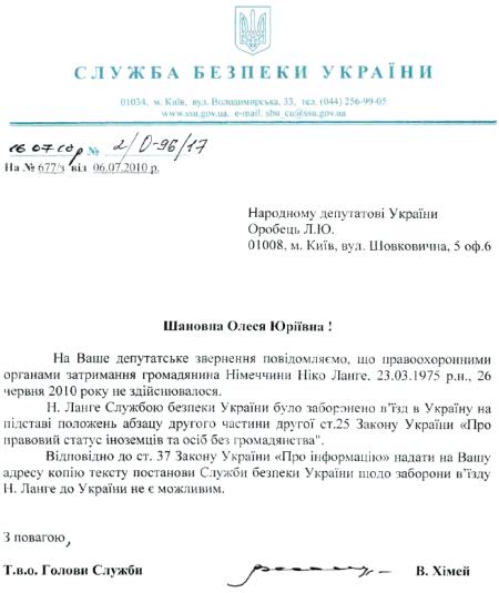 "Відповідно до закону про інформацію надати на Вашу адресу копію тесту постанови СБУ щодо заборони в'їзду Ланґе до України не є можливим", - сказано в документі.