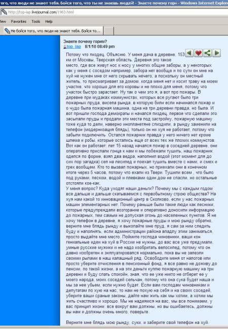 У ній користувач ЖЖ в різких висловах і з лайливими словами зазначав, що за нинішньої влади ситуація з протипожежними заходами у селі в Тверській області, де у нього є дача, гірша, ніж було за комуністичної влади.