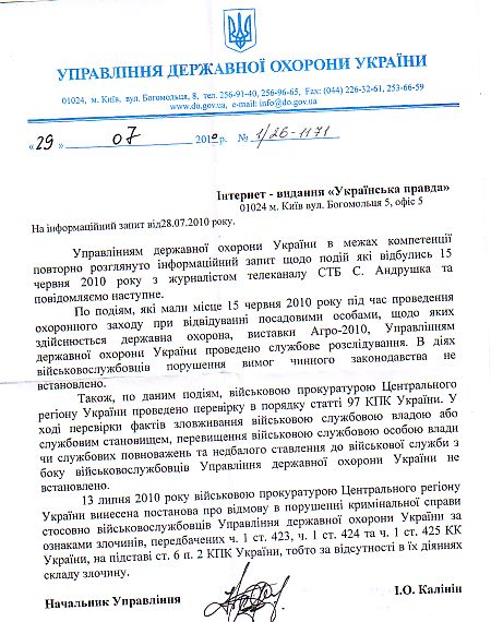 "По подіям, які мали місце 15 червня 2010 року під час проведення охоронного заходу при відвідуванні посадовими особами, щодо яких здійснюється державна охорона, виставки Агро-2010, Управлінням держохорони України проведено службове розслідування. В діях військовослужбовців порушення вимог чинного законодавства не встановлено", - йдеться у відповіді УДО.