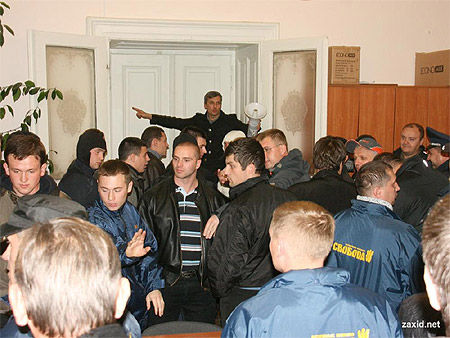 Активісти ВО "Свобода" галасують і не підпускають міліцію.