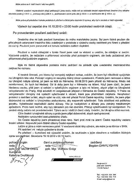 Із документа випливає, що перший раз чехи допитували Данилишина декілька годин - його затримали о 21:35 18 жовтня, а протокол допиту підписаний о 00:15 вже 19 жовтня.