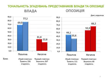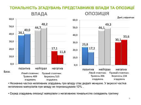 "Уже у вересні про владу добре говорили у 77,2% випадків, а негативно - лише у 22,8%. Натомість, якщо в травні про опозицію було 55,9% негативних згадок і 44,1% позитивних, то у вересні вже 66,2% негативних і лише 33,8% позитивних", - йдеться у повідомленні.