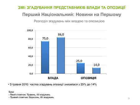 Як засвідчив моніторинг висвітлення влади та опозиції, здійснений на замовлення партії "Фронт Змін" компанією PRP Ukraine, частота згадувань опозиції впала з 33,5% у травні до 20,6% у вересні.