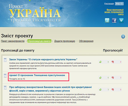 Так, один з юзерів пропонує проект закону "Про визнання Тимошенко злочинцем" ("посадити її на 12 років").
