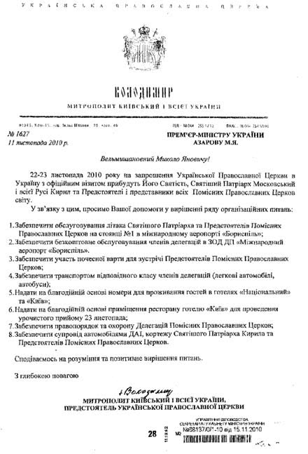 Зокрема, 11 листопада митрополит Володимир звернувся з листом до прем'єра Миколи Азарова щодо допомоги у "вирішенні організаційних питань", пов`язаних із візитом патріарха Московського Кирила та представників усіх помісних православних церков світу, які мають прибути в Україну 22-23 листопада.