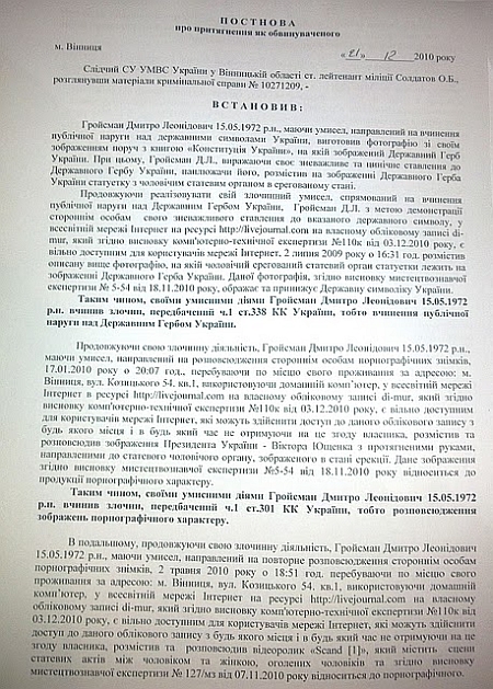 Згідно з постановою Слідчого управління УМВС у Вінницькій області, правозахисник обвинувачується у вчиненні злочину, передбаченого ч.1 ст.338 КК України "Наруга над державними символами України".