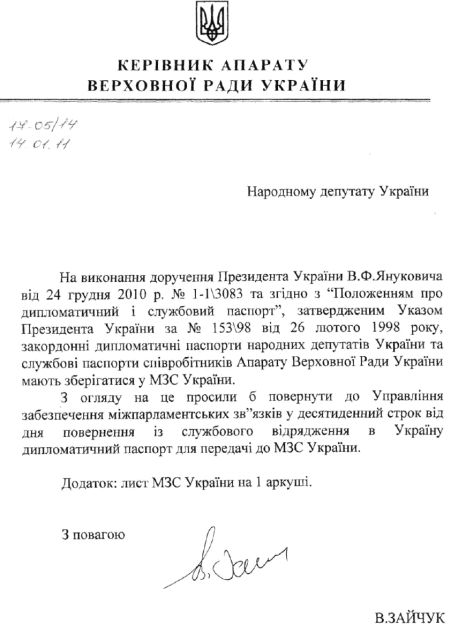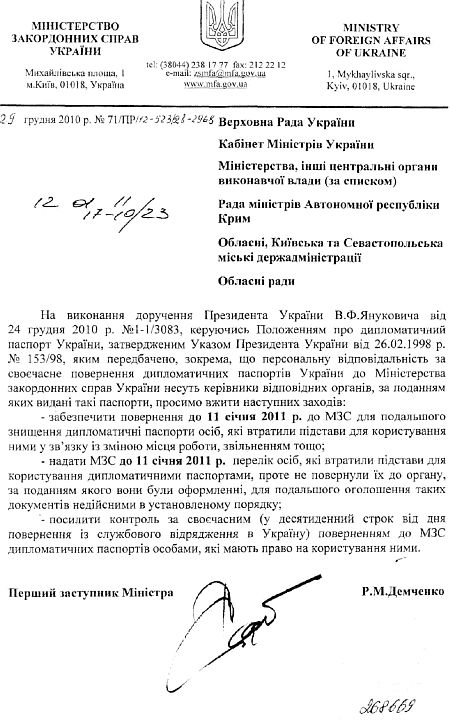 "На виконання доручення президента Януковича від 24 грудня 2010, керуючись положенням про дипломатичний паспорт, затвердженим указом президента в 1998 році, яким передбачено, зокрема, що персональну відповідальність за своєчасне повернення диппаспортів до МЗС несуть керівники відповідних органів, за поданням яких видані такі паспорти", - зазначається в документі.