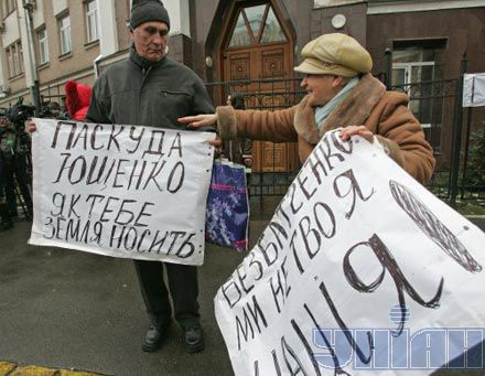 На фото мітингу проти Ющенка біля ГПУ в п`ятницю зафіксовані, зокрема, мітингуючі - літній колоритний чоловік у сірій в`язаній шапочці, який тримав образливий плакат і при цьому вступив в словесну перепалку з Ющенком, і жінка в бежевому пальті й бежевому кепі - яка також тримала "антиющенківський" плакат.