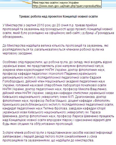 Зараз на сайті Міносвіти справді розміщене датоване 20 січня повідомлення: "з серпня 2010 року до 20 січня п.р. тривав прийом пропозицій та зауважень від громадськості щодо проекту Концепції мовної освіти, який було розміщено на офіційному веб-сайті у рубриці "Громадське обговорення".