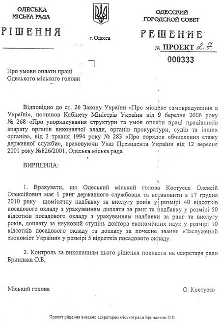 Згідно з документом, Костусєву з 17 грудня 2010 року повинні нараховувати надбавку за вислугу років у розмірі 40% посадового окладу з урахуванням доплати за 1-й ранг держслужбовця, надбавку в розмірі 50% з урахуванням надбавки за ранг і вислугу років, доплату за науковий ступінь доктора економічних наук у розмірі 10% посадового окладу й доплату за звання "заслужений економіст України" у розмірі 5% посадового окладу.