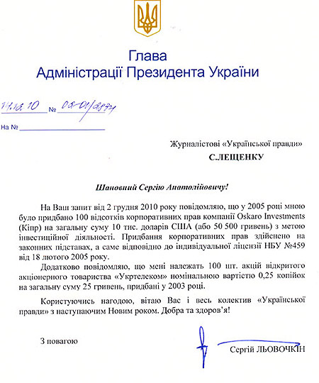 Глава адміністрації президента Сергій Льовочкін володіє акціями кіпрської фірми Oskaro Investments.
