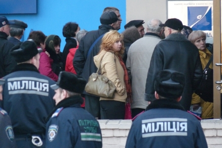 Як повідомляє кореспондент "Української правди", під банком зібралися люди, щоб отримати свої 150 гривень від вкладу.