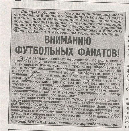 Міліція міста Авдіївка Донецької області просить футбольних уболівальників прибути у відділення і внести свої дані в спеціальну базу даних.