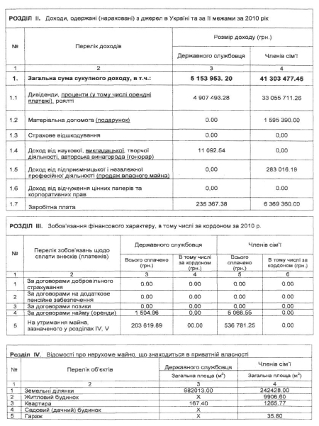 Члени родини чиновника (дружина, два сини і донька) в 2010 році отримали більше 41 мільйона гривень доходу.