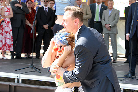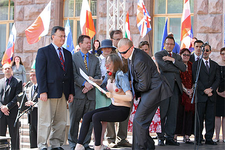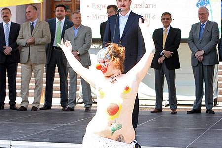Під час виступу голови КМДА Олександра Попова на майданчик перед трибуною, де перебували міністр закордонних справ Костянтин Грищенко, голова представництва Євросоюзу в Україні Жозе Мануель Пінту Тейшейра та інші офіційні особи, вибігли дві дівчини з оголеними грудьми.