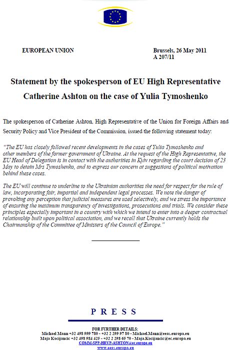 Про це заявив речника Верховного представника Союзу з питань зовнішньої та безпекової політики Кетрін Ештон, повідомляє прес-служба посольства ЄС в Україні.