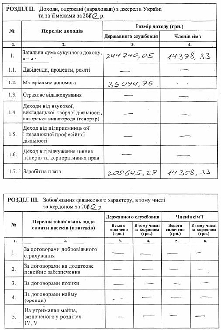 Зокрема, він отримав 209,64 тисячі гривень заробітної плати і більше 35 тисяч гривень матеріальної допомоги.