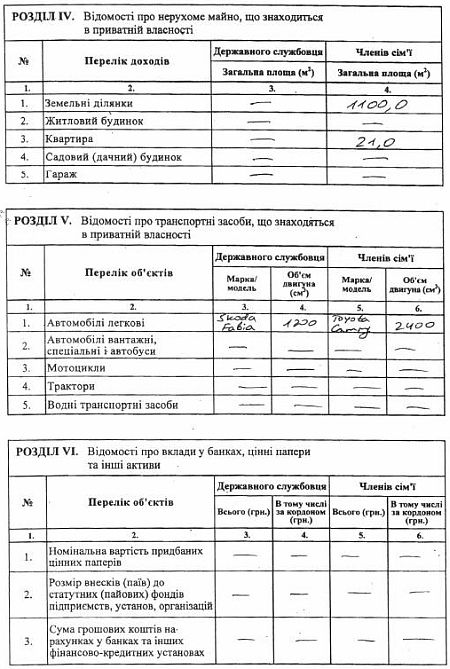 Депутат має автомобіль Skoda Fabia (об’ємом двигуна 1200), його сім`я - Toyota Camry (2400).