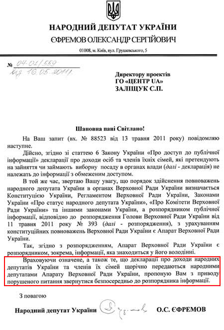 "Враховуючи означене, а також те, що декларації про доходи депутатів щорічно передаються депутатами Апарату Верховної Ради, пропоную вам з приводу порушеного питання звернутися безпосередньо до розпорядника інформації", - зазначив Єфремов на запит про його декларацію.
